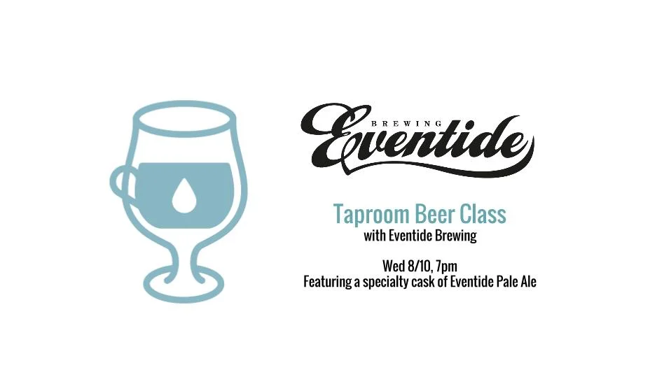 Join us for our August Beer Class with Eventide Brewing. $12 ticket includes a tasting flight and discussion, and Eventide will be bringing in a specialty cask of their Pale Ale, just for the class. Must be 21 or over.